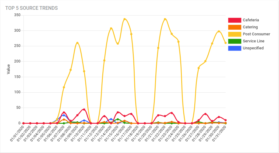 The Leanpath 360 FS system also allows kitchens to set goals to reduce waste over a certain time period, during a certain type of production, or for a certain product. BVSD uses this feature regularly and has implemented new procedures for breading chicken and salad bar preparation. For example, after setting a goal of reducing breading waste, it became clear that adding the breading mix to the machine at multiple times during a prep session could reduce waste by more than 25%, instead of adding the entire mix at the beginning. This simple change did not incur significantly more labor time and yielded an obvious cost savings and waste reduction.