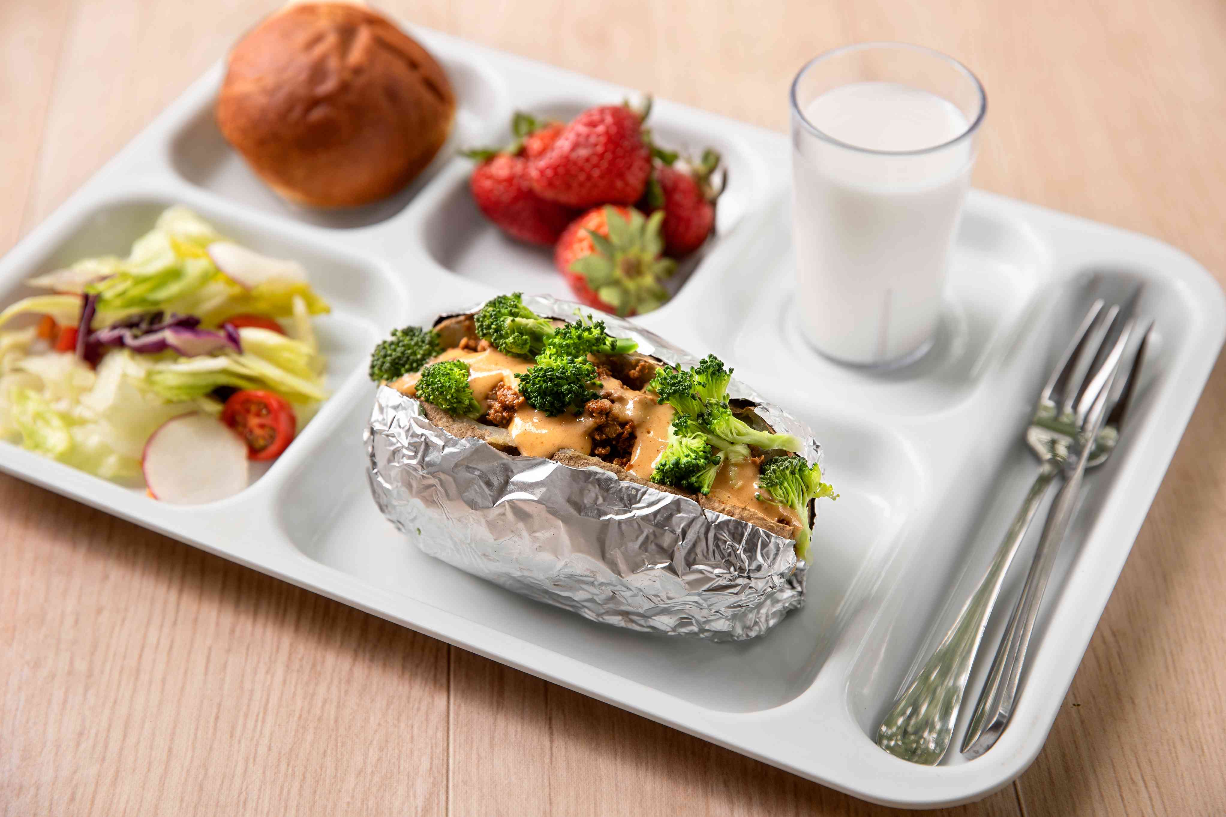 Top each potato with 3 oz taco meat, 1 oz broccoli, and 2 oz cheese sauce.