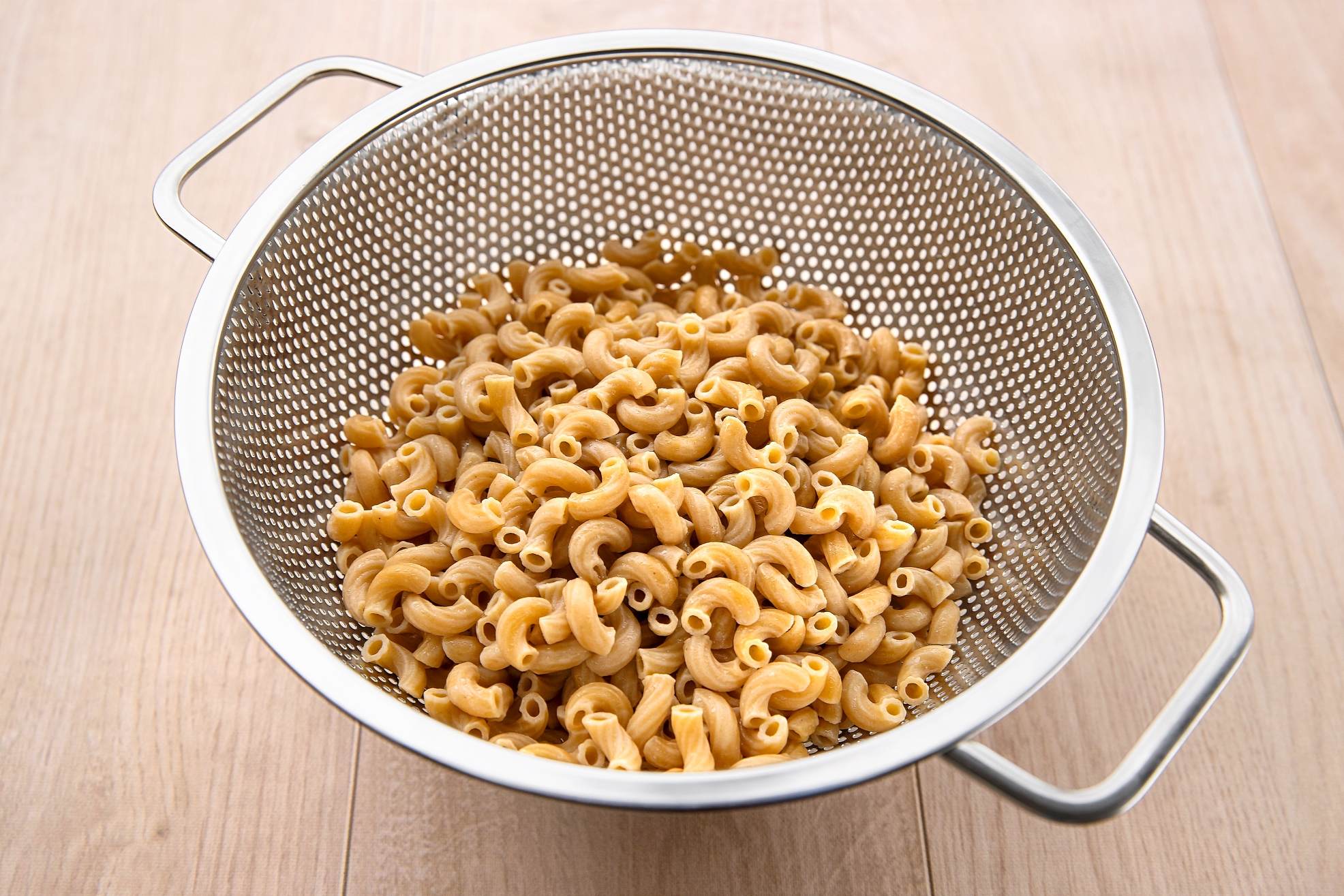 Scoop pasta out with a large strainer and place it in a colander to drain.