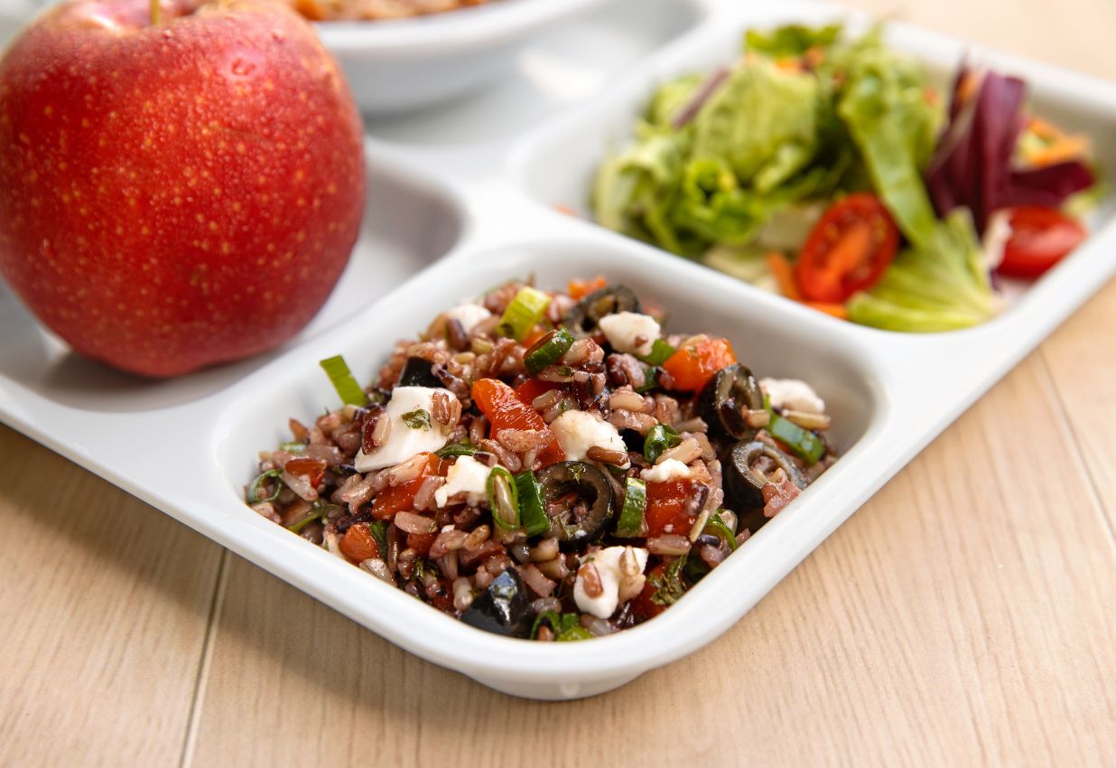 Mix together the cooled rice, olives, feta, roasted red peppers, green onion, and oregano.