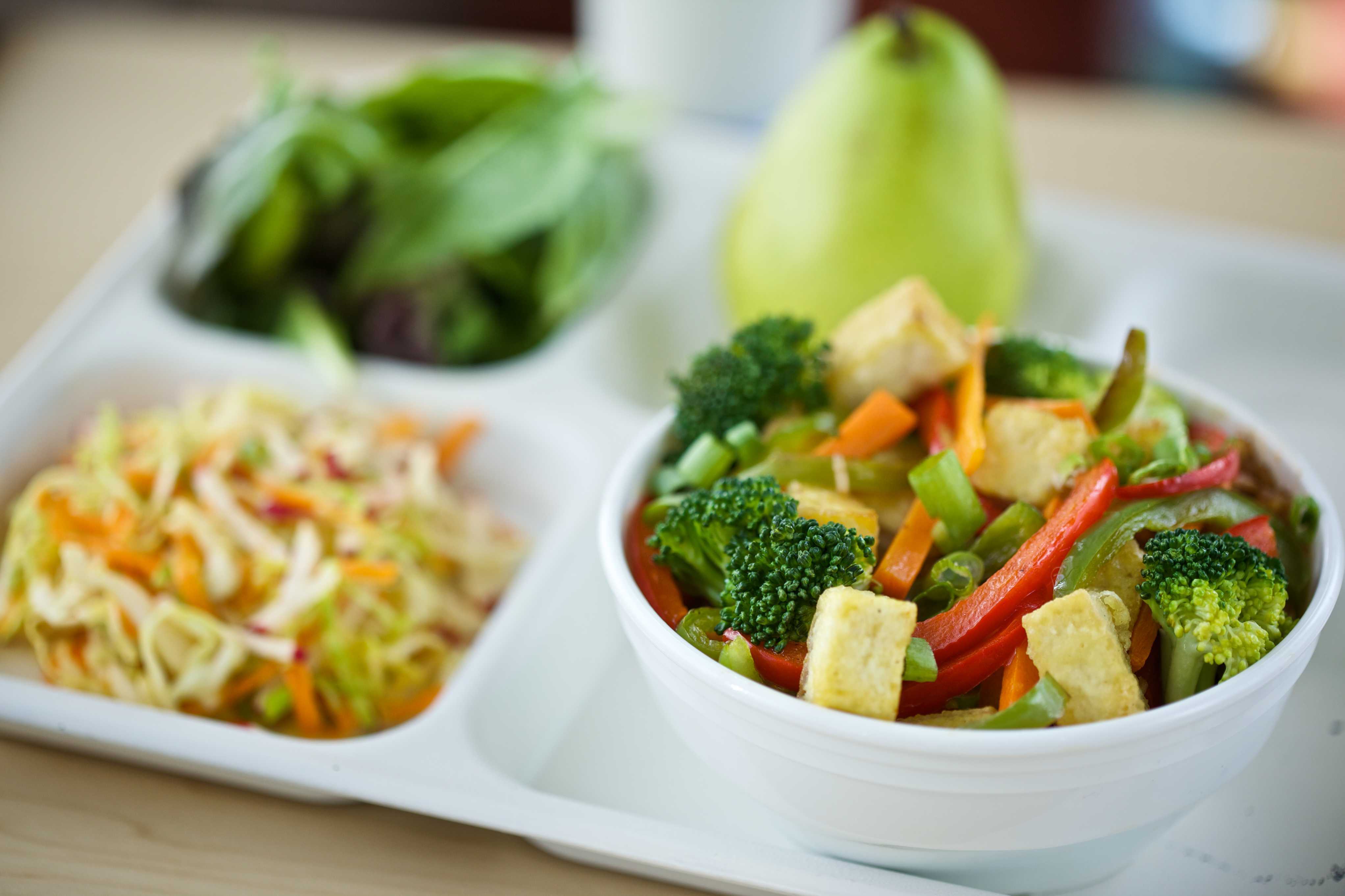 Add 4 oz cooked tofu per hotel pan and mix with vegetables until evenly coated with sauce.